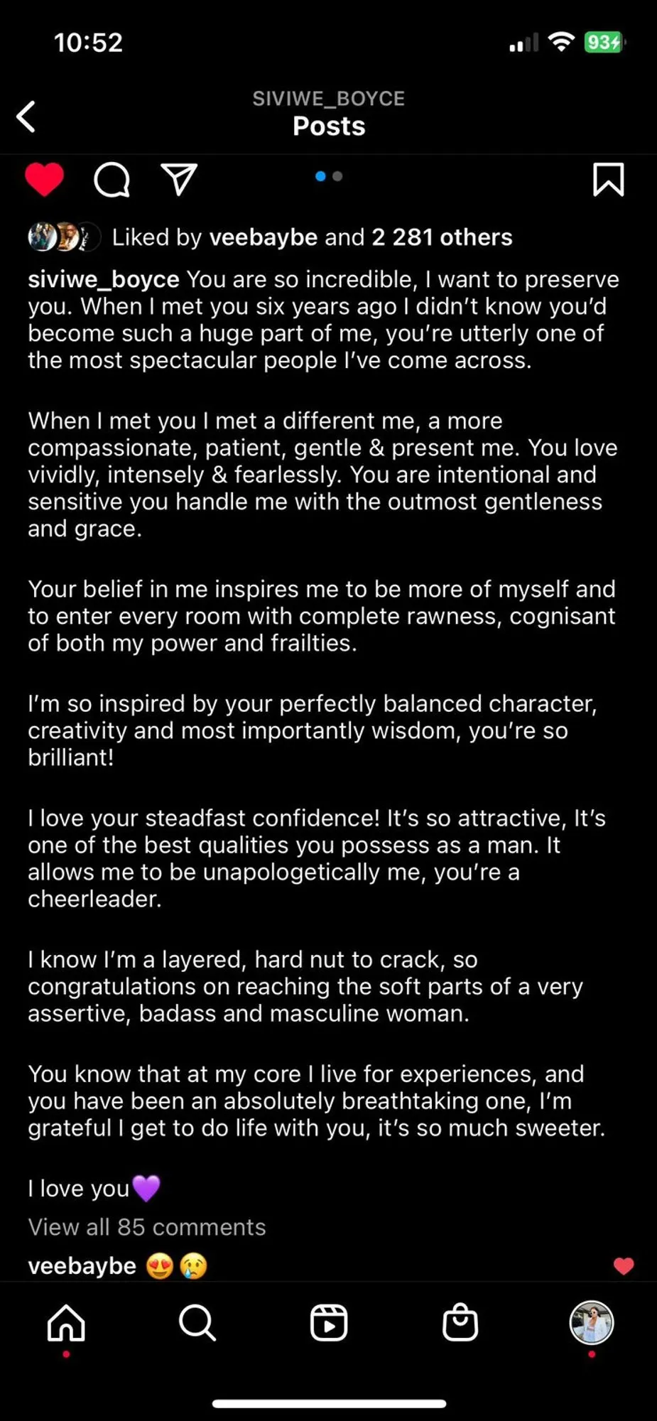 Siviwe Boyce said: “Love is words of affirmation and most importantly doing the things you say you will do, showing up for the person you love and being present in more ways than one. Love is a verb.”
