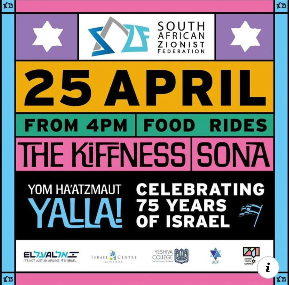 Earlier this month, the SAZF announced the commemorative party for Yom Ha’atzmaut (Israeli Independence Day) on April 25 at the Yeshiva College in Johannesburg, with music performances by The Kiffness and Sona.