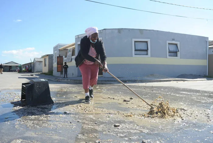 A file picture of a Khayelitsha resident sweeping an overflow of brown sewage in the middle of the street with a broom. Khayelitsha resident Sheila Maqwentshu is cleaning sewage in front of her Educare centre – which she had to close because of sewer blockages in the area. File Picture: Ayanda Ndamane/African News Agency (ANA)