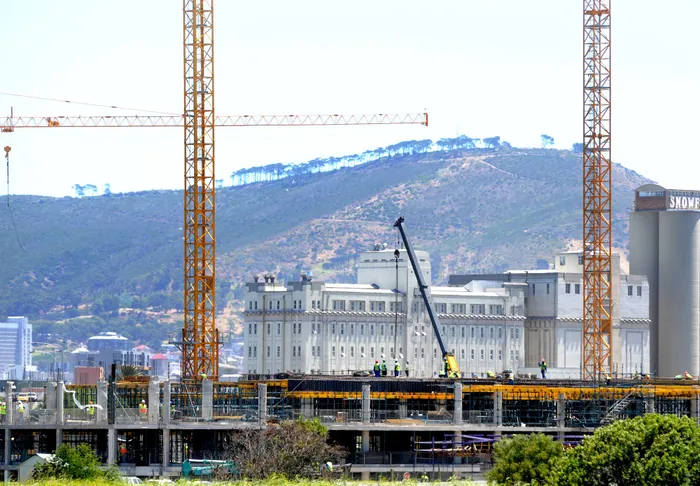 The image above contains construction cranes and workers on the River Club site where they are building Amazon’s HQ. The background of the image contains buildings, and signal hill. The Observatory Civic Association (OCA) has been trying to stop construction at the River Club site pending a legal battle over development approvals. Picture: Ayanda Ndamane/African News Agency(ANA)
