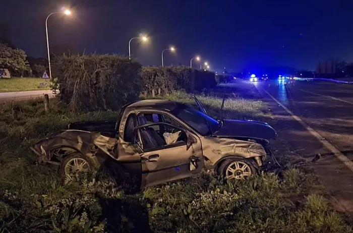 Dented and bent shell of the crashed car beside the road in a picture taken at night. The bakkie which carried 11 people that crashed near Brackenfell on the N1 near the R300 on Sunday night. Picture: Titanium Securitas/Facebook