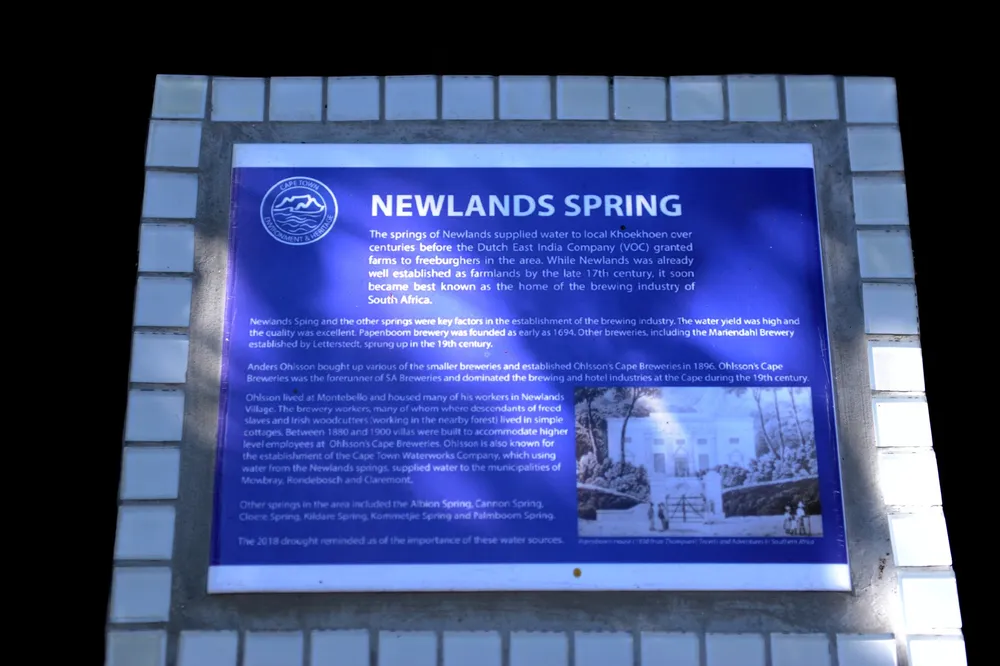 While briefly mentioning the use of the Newlands springs by local Khoekhoen, the plaque titled “Newlands Spring”, situated at Springs Way, largely recognised and memorialised the spring’s role in the brewing industry and that of Scandinavian businessman, politician and local property and water owner, Anders Ohlsson, who established Ohlsson’s Cape Breweries in 1896.