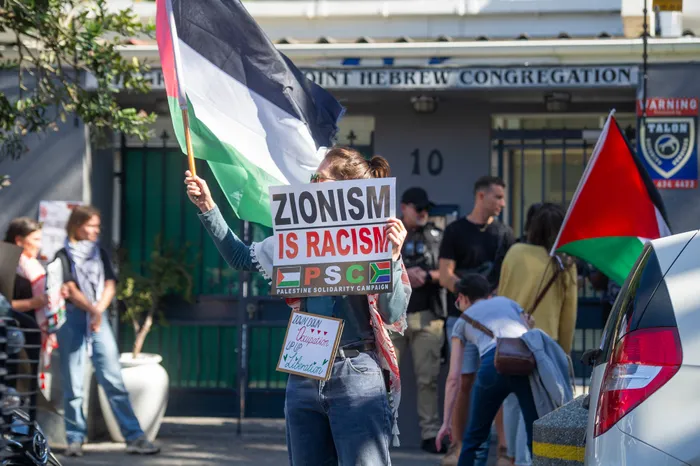 On Thursday, a group of pro-Palestine supporters gathered to protest outside the Green & Sea Point Hebrew Congregation, where the Aliyah Expo was being held.