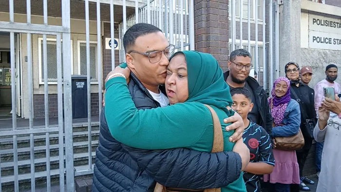 Ebrahiem Barendse embraces a family member. Picture: Mandilakhe Tshwete