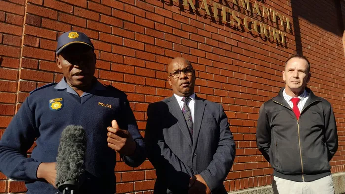 Western Cape Police Commissioner Thembisile Patekile, Brigadier Makhaya Mkabile and Lieutenant-colonel Dirk van Reenen outside the Cape Town Magistrates Court. Pic: Mahira Duval