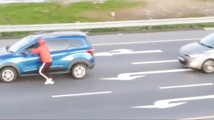 The video, captured by a drone, showed a suspect wearing a bright orange shirt breaking at least three car windows within five minutes on Malibongwe Drive and the N7.