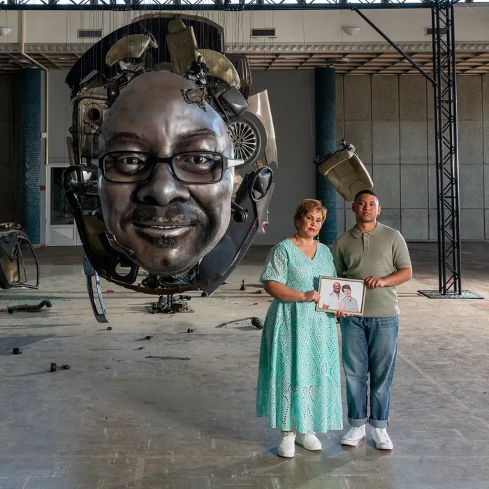 Lucian and Dayne Sampson remember their husband and father, in front of a sculpture of his face. Picture: SAB