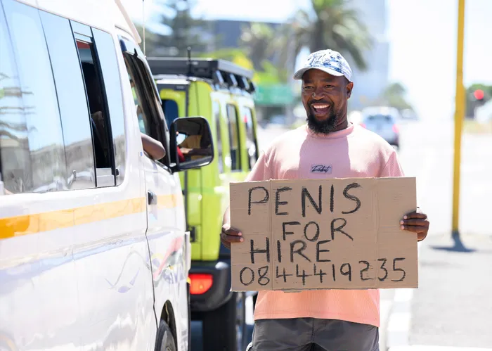 David Dyarithi, 35, started trending on social media this week when photographs taken of him by a motorist, showing him holding a piece of cardboard reading “Penis for Hire” along with his phone number, was shared on Facebook.
