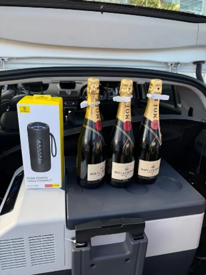 A search of the vehicle led to the discovery of three bottles of champagne worth approximately R3 000, an electronic cooler box with multiple chargers and a Bluetooth speaker.