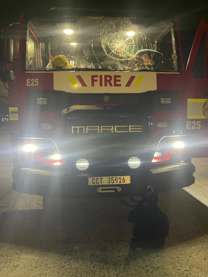 The firefighters were returning to base after putting out a vegetation fire in Connaught Estate when their vehicle was stoned along 35th Street, between Bishop Lavis Drive and Robert Sobukwe Road on October 30.