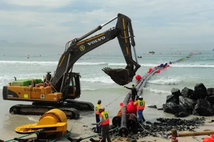 Engineers seen moving large pipes into place with the help of excavators and tugboats at the Strandfontein Pavilion Desalination site in 2018.