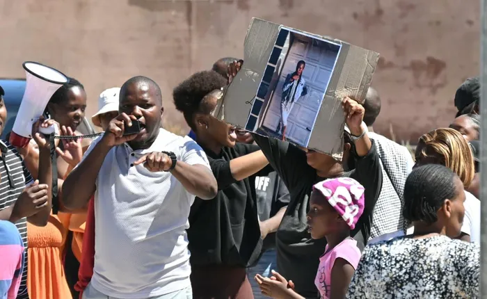 Community members protest outside the Khayelitsha Magistrates’ Court.