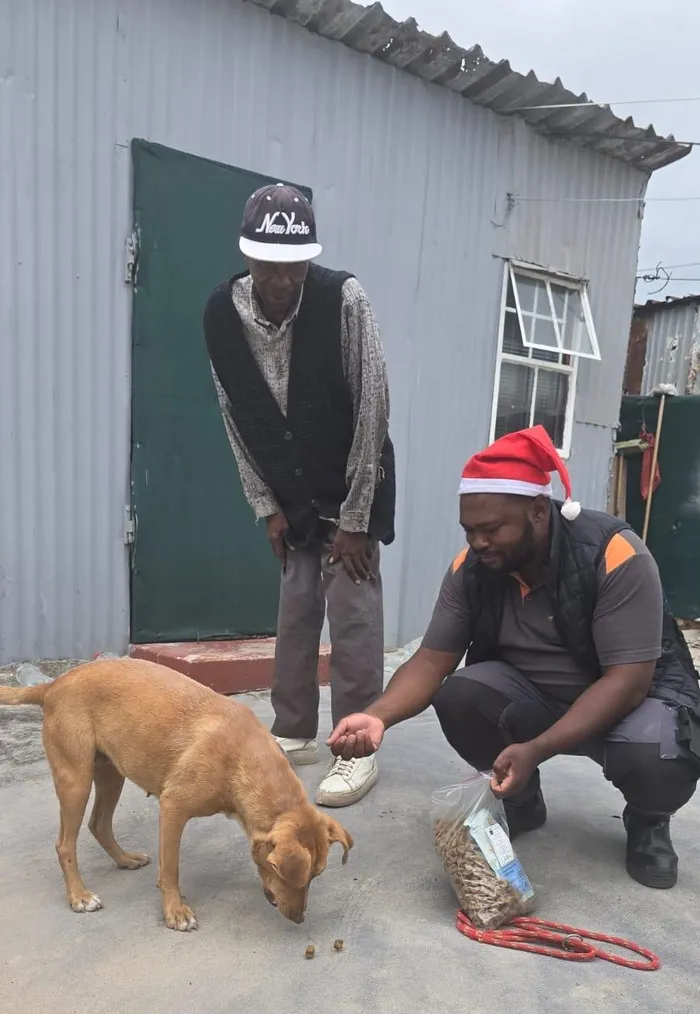 Festive kindness on four legs: A Khayelitsha resident watches as a Mdzananda Animal Clinic and Shelter staff member hands out pet food during a Christmas outreach on 23 December, part of an initiative that saw 332 food gift packs distributed to dogs and cats across the township.