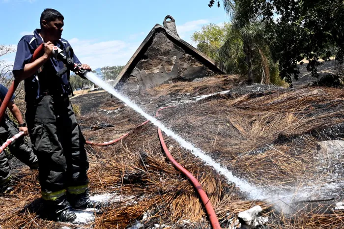 Fire crews were called to a fast-spreading grass fire along Bodal Road, where flames quickly jumped to Roggeland, one of the oldest farmsteads in the Dal Josaphat Valley. By the time firefighters arrived, the first historic thatched house was already alight, with two more structures directly in the fire’s path.