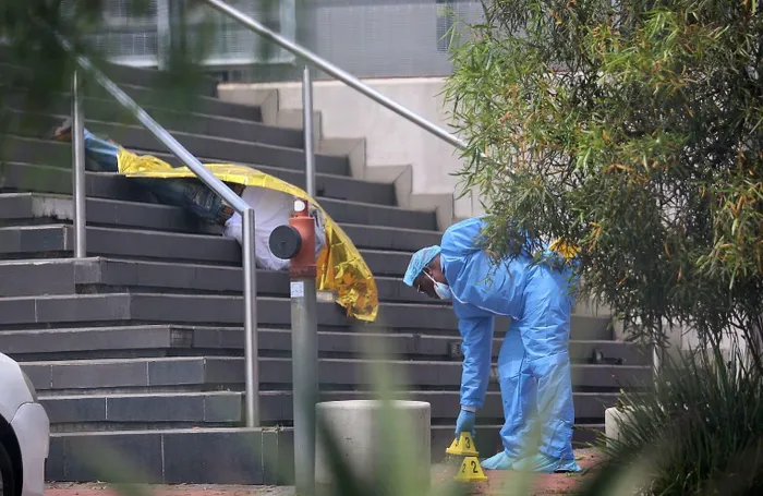 Forensic investigators work at the scene outside the Booysens Magistrates’ Court in Johannesburg after a deadly shooting that left two people dead and several others wounded.