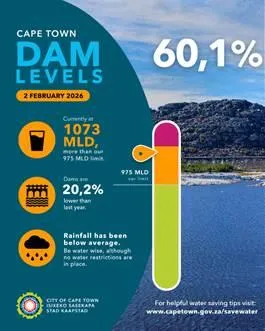 The current situation reflects a concerning trend: since December 2025, water levels in Cape Town's dams have dwindled by approximately 2% each week, and sustaining these levels is critical as the City awaits the next seasonal rainfall cycle.