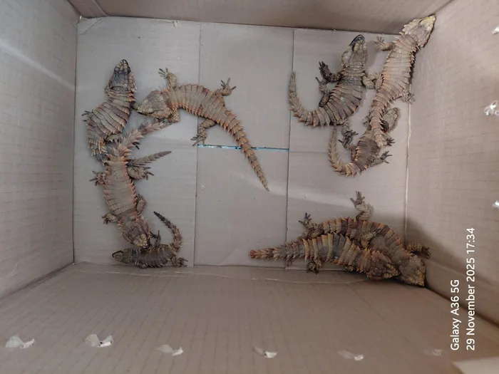 Some of the 22 protected Armadillo Girdled Lizards seized from a hotel room in Vredendal on November 29, 2025.