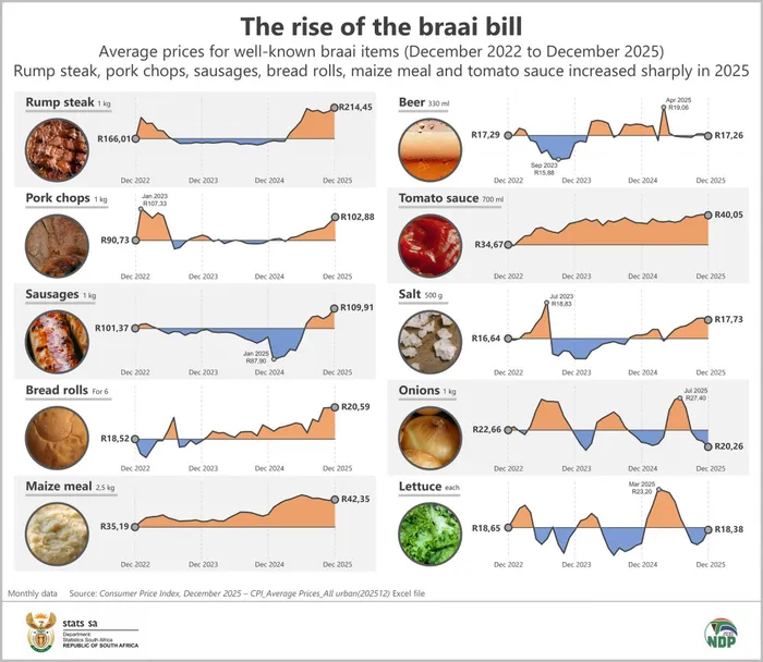 From steak to pap, several braai staples have risen sharply since 2022 — with rump steak up 29% by December 2025, according to Stats SA data.