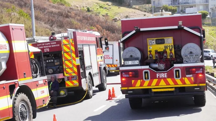 City of Cape Town Fire & Rescue vehicles on Phillip Kgosana Drive as crews respond to multiple vegetation fires near Devil’s Peak.