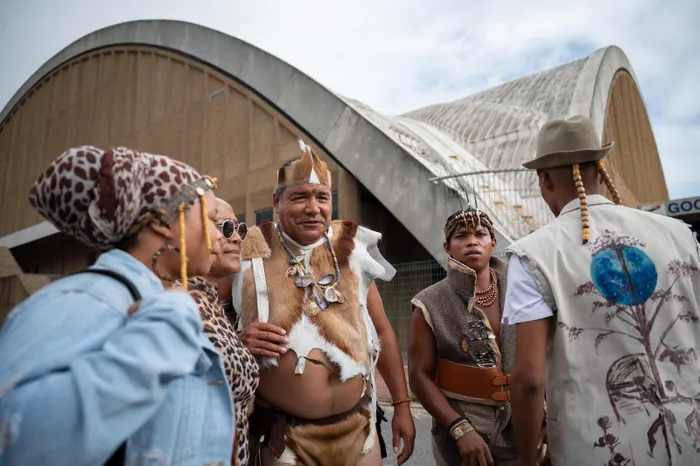 Khoi-San representatives gather outside the Good Hope Centre during protests against the City’s planned land auction.