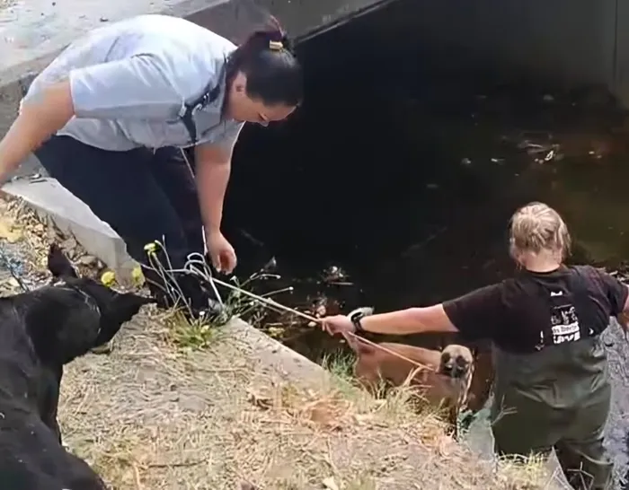 Working methodically, the team secured one dog before moving towards the other two. With careful coordination and the use of ropes, all three animals were restrained and guided out of the canal.