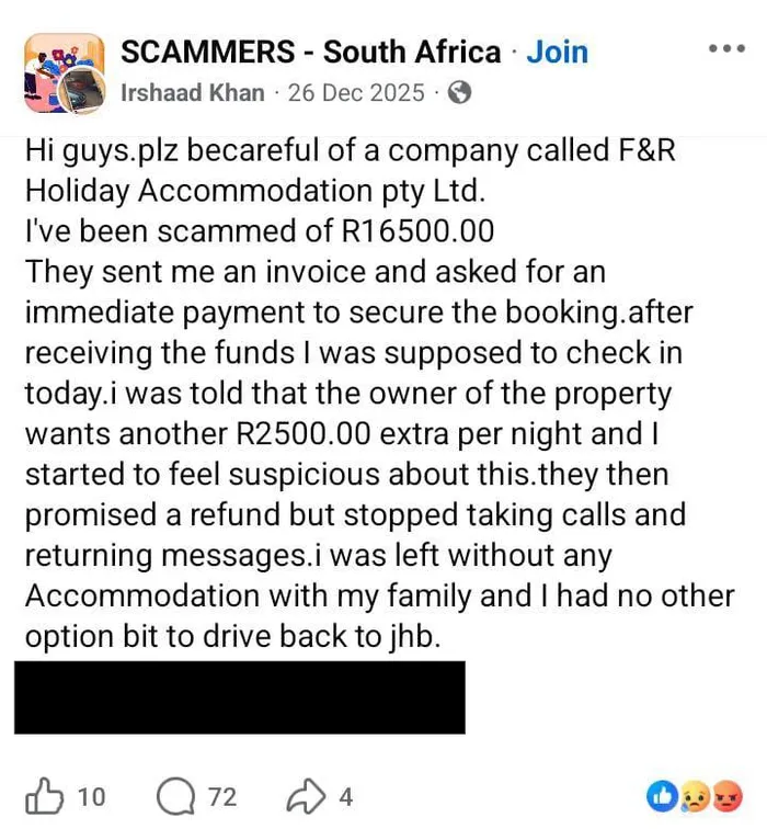 Shabodien said: “I saw on Facebook their names and people saying that they were scammed by them, and I got a bit worried. I was informed that our booking was cancelled because no payment was made to secure our holiday accommodation.