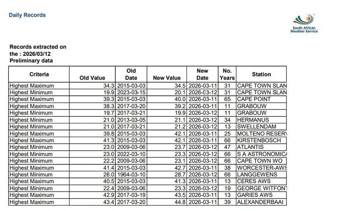 SA Weather Service data shows several Western Cape stations breaking long-standing March temperature records during the recent heatwave.
