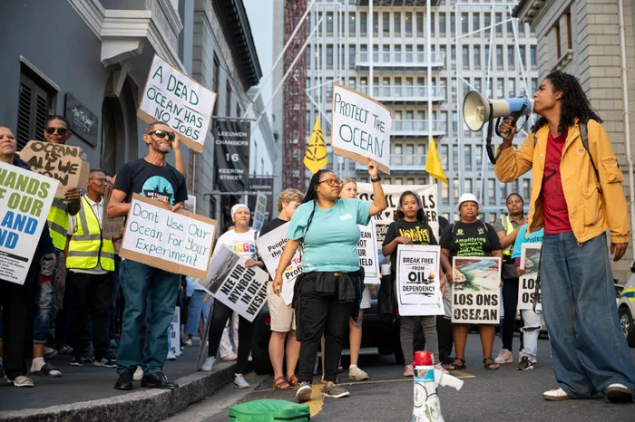 Ocean activists and small-scale fishers gathered outside the Western Cape High Court on Monday to protest proposed offshore oil and gas exploration along South Africa’s West Coast.
