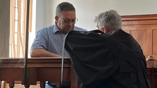 Defence attorney William Booth consulting with his client Shaun Roos.