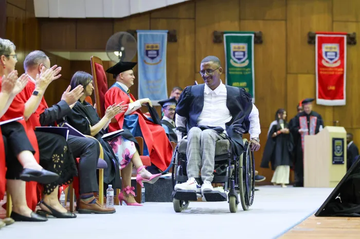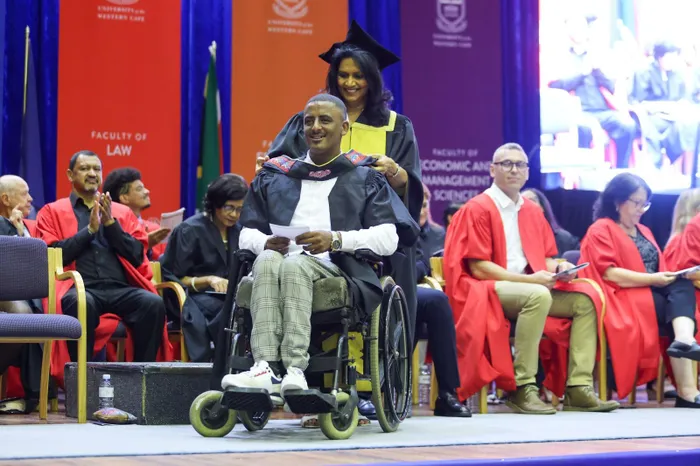 Riyaadh Kader receives his LLB at UWC, marking a major milestone in his journey after being paralysed at 13.