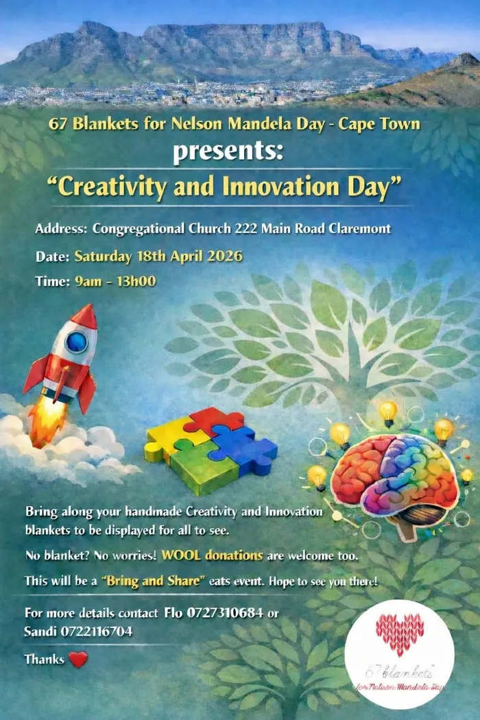 Cape Town residents will gather in Claremont on 18 April for a 67 Blankets for Nelson Mandela Day Creativity and Innovation Day event, bringing handmade blankets, yarn and community spirit together to support vulnerable communities.