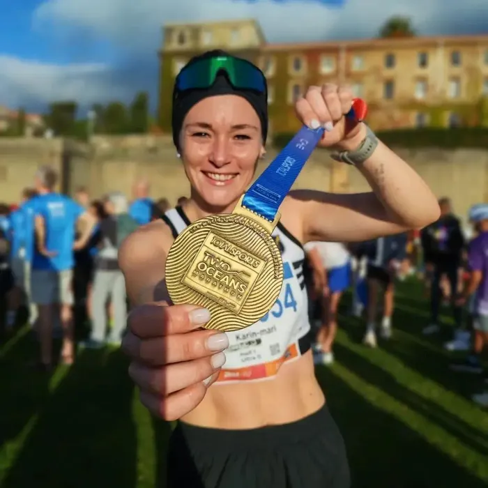 Karin-Mari Dötze celebrates what she believed was a Top 10 finish at the Two Oceans Marathon half marathon, before a results error briefly dropped her to 12th place.