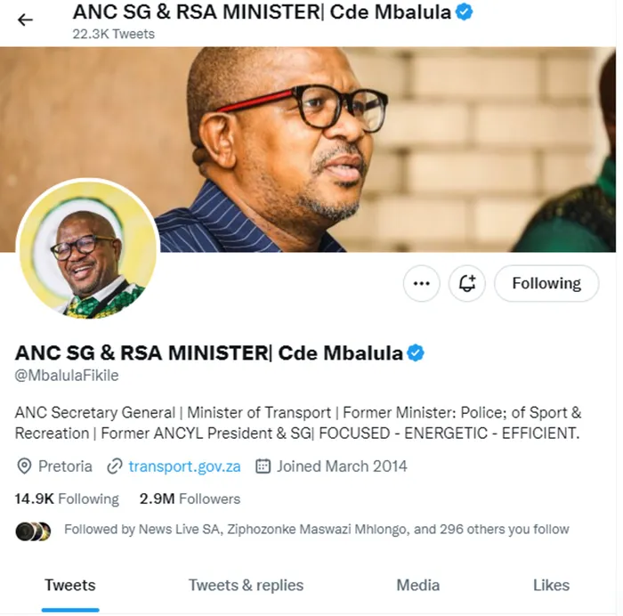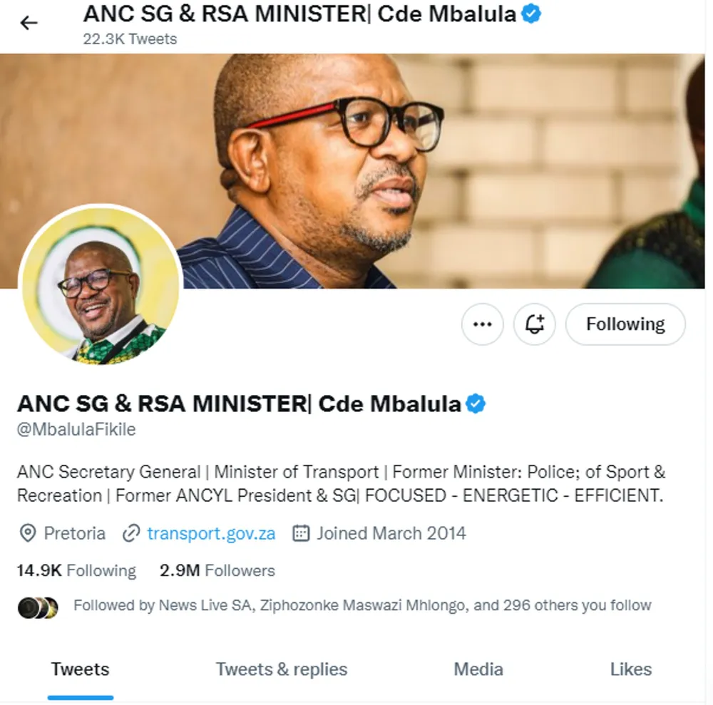 With more than 2 million followers, Fikile Mbalula tops the list as one of the government's leading Twitter account holders.
