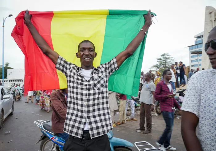 A man holds a national flag as he celebrates with others in the streets in the capital Bamako, Mali Tuesday, Aug. 18, 2020. Mutinous soldiers detained Mali's president and prime minister Tuesday after surrounding a residence and firing into the air in an apparent coup attempt after several months of demonstrations calling for President Ibrahim Boubacar Keita's ouster. (AP Photo)