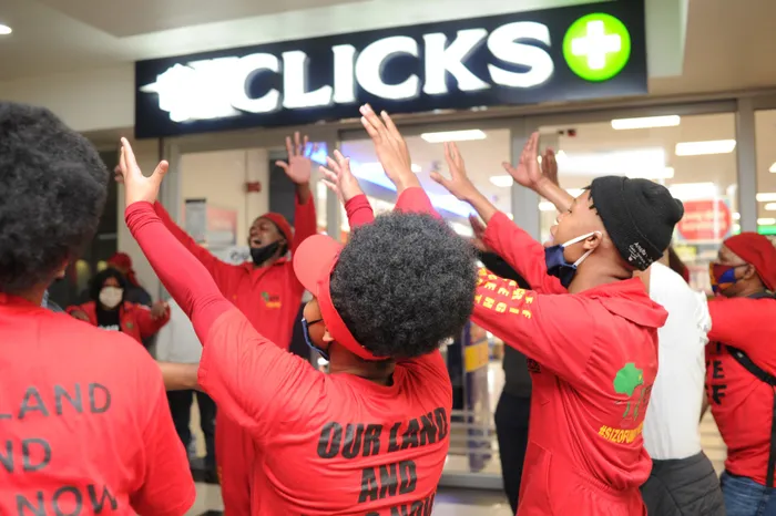 South Africa - Cape Town - 7 September 2020 - EFF members outside the Clicks store in Goodwood Mall. On Monday morning, the EFF started their planned week-long occupation of Clicks stores, with members singing and dancing outside of multiple stores in Cape Town.Economic Freedom Fighters (EFF) members in Western Cape have heeded their national leadership’s call to close all Clicks stores in light of "unrepentant and perverse racism". The protest come after the furore of images on the Clicks website portraying black hair types with captions reading "Dry and Damaged" and "Frizzy and Dull" and white hair types as "Normal" and "Fine and Flat". Picture: Henk Kruger/African News Agency (ANA)