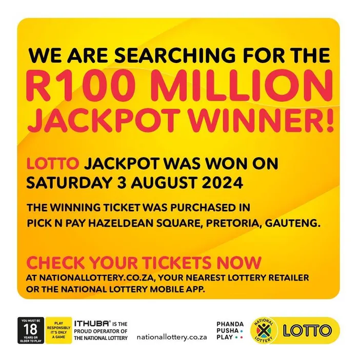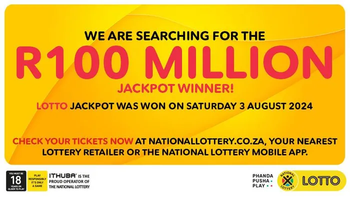 LOTTO - R100 Million Jackpot Winner The highly anticipated R100 Million guaranteed LOTTO jackpot from draw number 2461 held on 3 August 2024, was won by one lucky participant