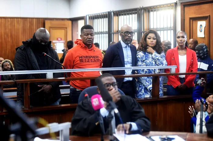 Controversial businessman Vusimuzi “Cat” Matlala (centre) and his co-accused at the Alexandra Magistrate's Court on Tuesday. The case has been transferred to the High Court in Johannesburg, where it is set to begin on January 29, 2026, for trial.