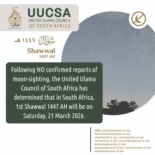 "Consequently, in South Africa, the 1st day of Shawwal 1447, the day of Eid-ul-Fitr, corresponds to Saturday 21st March 2026, in-sha-Allah," it said.