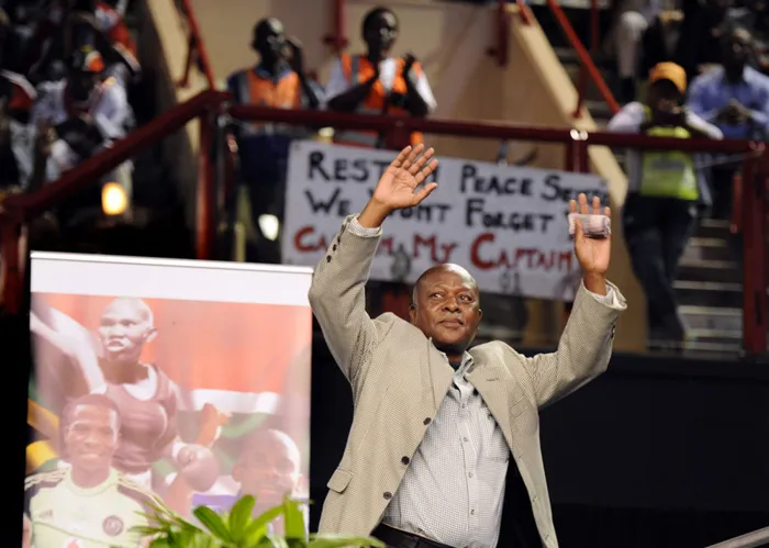 The father of Senzo Meyiwa, Sam Meyiwa, acknowledges the crowd. A memorial was held at the Standard Bank Arena to honour three recently deceased athletes: Senzo Meyiwa, Phindile Mwelase and Mbulaeni Mulaudzi. Picture: Chris Collingridge / Independent Media