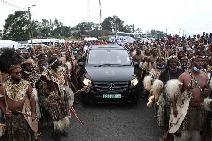 The Zulu king’s mortal remains arrived at his home in KwaNongoma accompanied by amabutho and maidens. Picture: Doctor Ngcobo / ANA