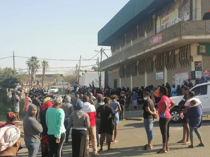 People queue outside a shop. Residents stand in line outside only supermarket in Mayville which is still trading, in the hope of buying basic food items on Wednesday after shops throughout the province were looted. Picture: Nqobile Mbonambi/African News Agency (ANA)