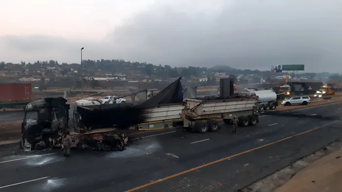 Protesters burnt trucks parked at the Mooi River toll plaza during the unrest two weeks ago. Picture: Nqobile Mbonambi/African News Agency (ANA)