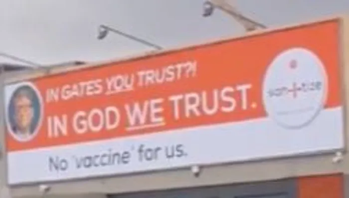 A Cape Town-based company that sells personal protective equipment (PPE) and sanitisers erected the anti-vaccine billboard, which states: ’’In Gates you trust. In God we trust. No vaccines for us.’’