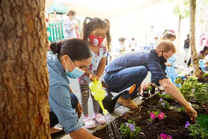 Prince Harry and Meghan Markle, the Duke and Duchess of Sussex, plant flowers and forget-me-nots during a visit to the Assistance League Los Angeles' Preschool Learning Center last month. Picture: Matt Sayles via Reuters