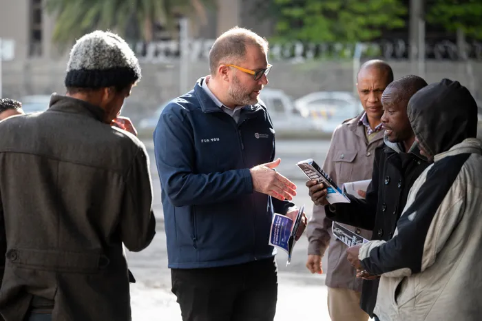 Social Development MEC, Jaco Londt, handed out pamphlets with information on human trafficking to commuters around the Cape Town Train Station and the Inter-Provincial Bus Terminal in July. Picture: Armand Hough / Independent Newspapers