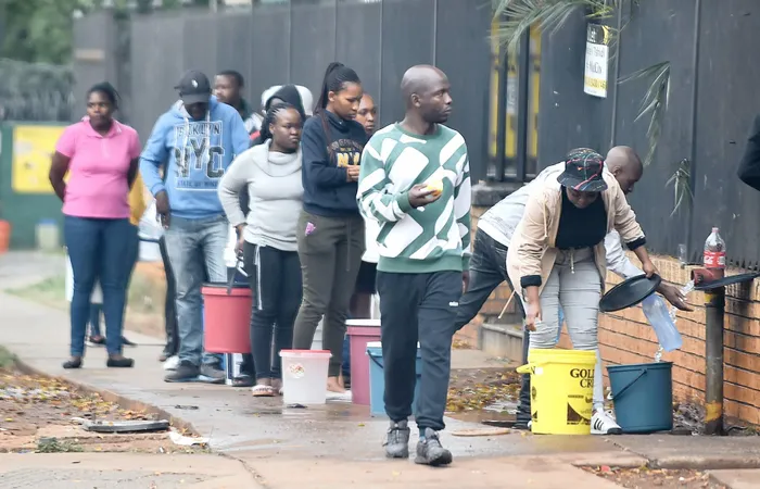 Residents help themselves to water from a fire hydrant near Burgers Park in the CBD. The area is one of those hit by water interruption since the weekend. Picture: Thobile Mathonsi African News Agency (ANA)