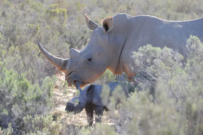 Rhinos on a game farm. Dawie Groenewald and Schalk Steyn were apprehended by the Hawks after being caught transporting 19 rhino horns in two bakkies. Picture: African News Agency (ANA)