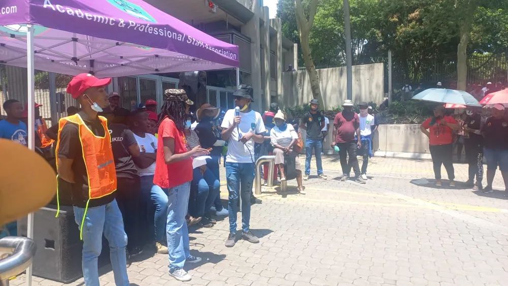 A group of over 500 workers associated with the Academic and Professional Staff Association of South Africa (APSA) gathered outside the university's entrance earlier today demanding that the university's Vice-Chancellor and Principal Professor Tawana Kupe come down and address workers' challenges himself instead of sending his subordinates to do the job.