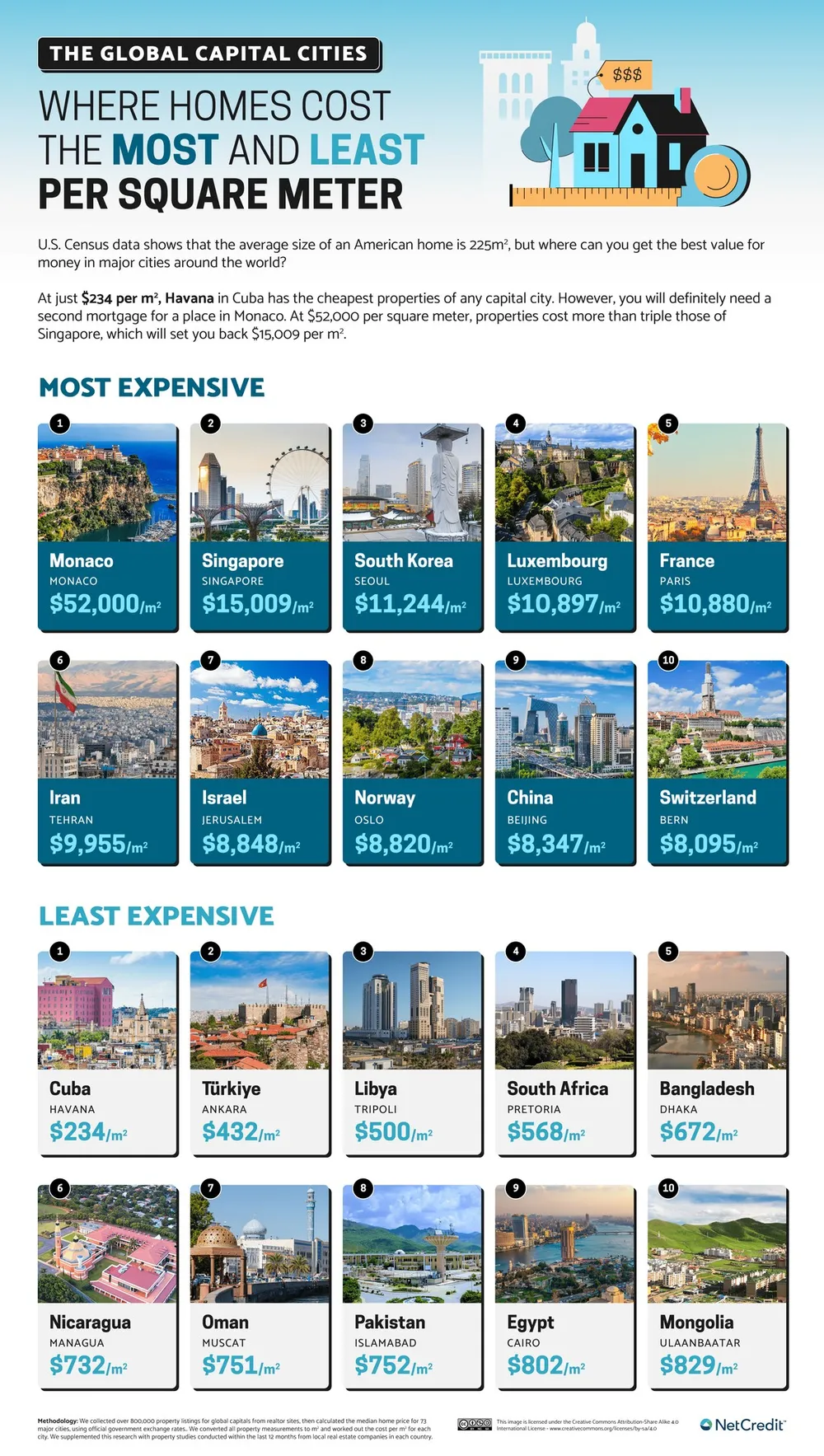 The capital with the cheapest average home, at a price of $40 569 (R743 000), is Havana in Cuba, while the Mediterranean coastal city of Monaco is the most expensive, with an average home price of $4.475m (R80.8m).