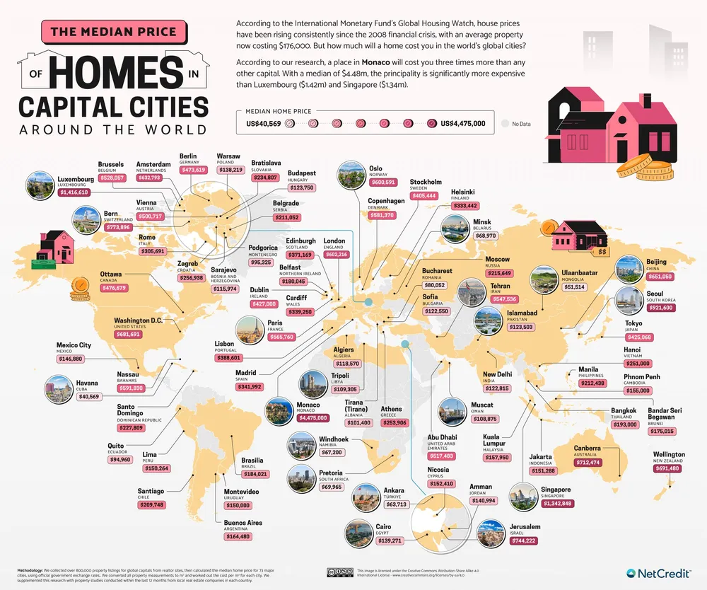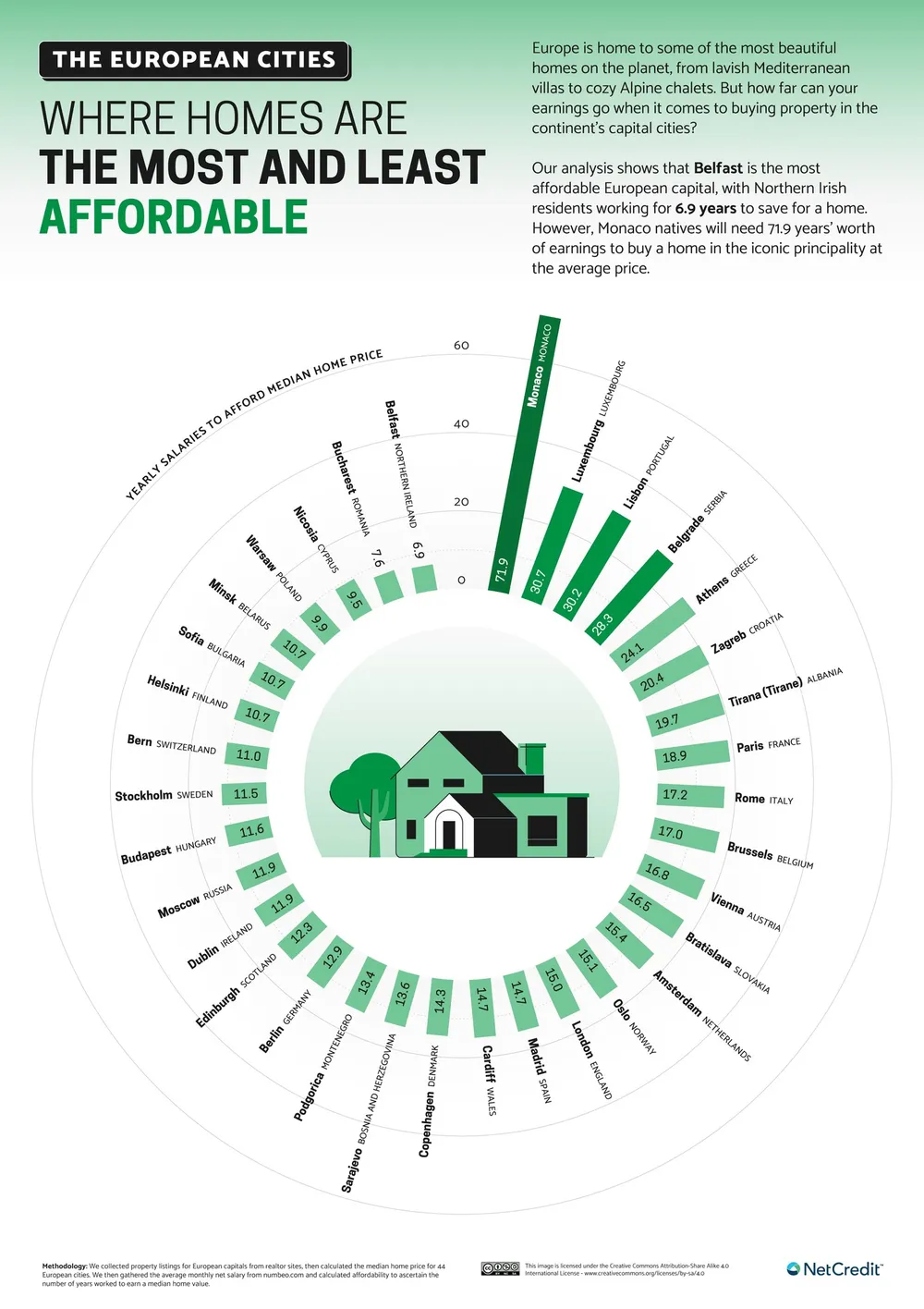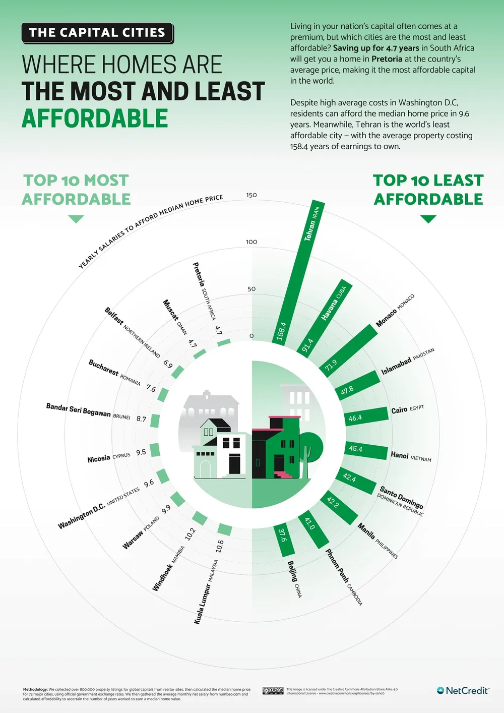 * NetCredit analysed over 800 000 online property listings for 73 global capitals and calculated the median house price for each city in total and per square meter. It researched the average monthly net salary for each capital using numbeo.com and used this figure to calculate affordability and the number of years the average earner would need to work to buy a median-value home. The data was collected in October 2022.